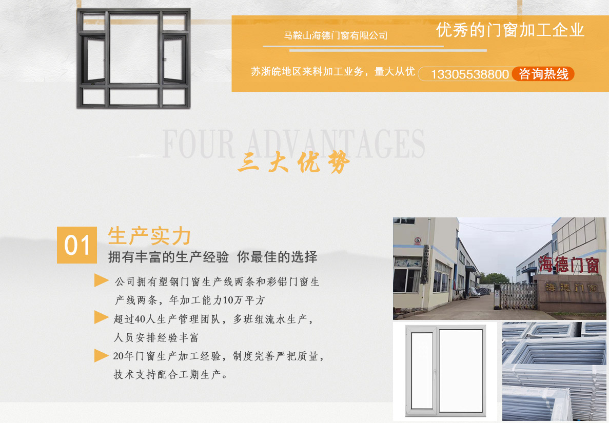 馬鞍山海德門窗有限公司是一家主營門窗加工的公司,公司主要從事塑鋼門窗、彩鋁門窗、鋁合金陽臺欄桿、鋁合金百葉窗的生產加工。擁有一批熟練的技術工人和設計人員,有著20多年的門窗加工制造經驗。現擁有2條塑鋼門窗生產線和2條彩鋁門窗生產線,1年加工門窗十萬平方米。公司坐落在馬鞍山國家經濟技術開發區,距離馬鞍山高速公路南出口僅3公里,已多次承接了大型門窗來料加工的業務,受到客戶的一致好評。隨著市場的發展和公司的定位,公司愿大量承接蘇浙皖及周邊地區的門窗來料加工業務。隨時歡迎各新老客戶的來電咨詢及上門參觀洽談,客戶的滿意是海德門窗進步前行的動力。