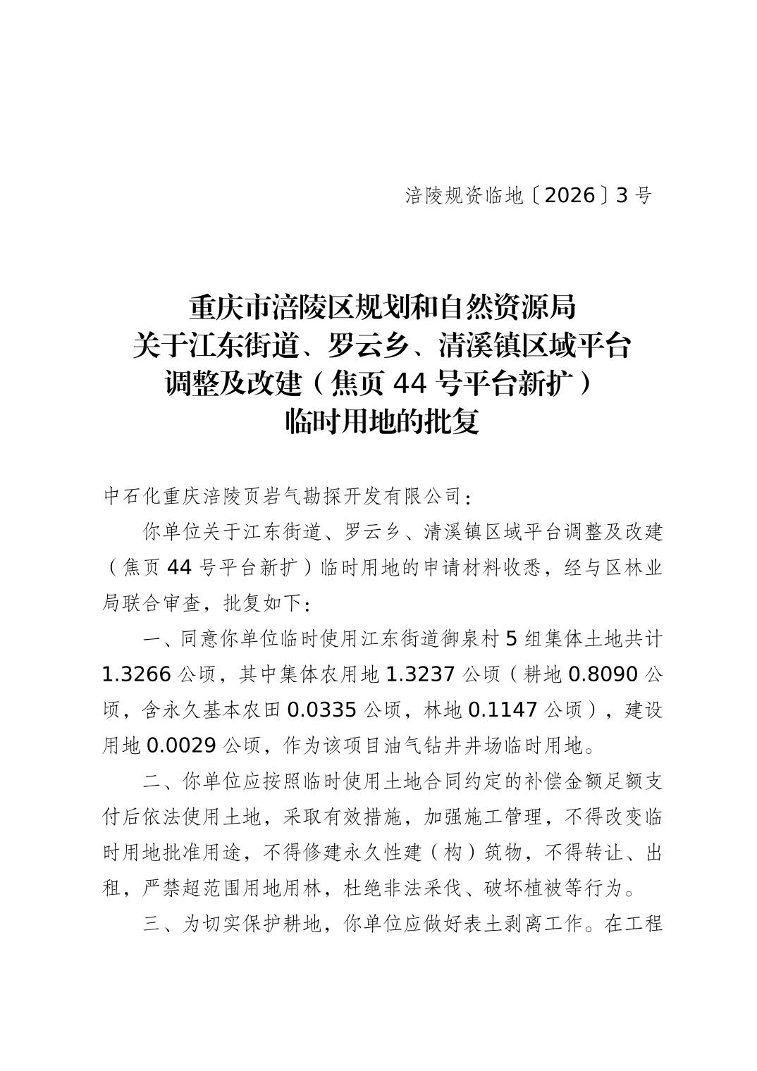 涪陵規資臨地[2026] 3號 關于江東街道、羅云鄉、清溪鎮區域平臺調整及改建(焦頁44號平臺新擴)臨時用地的批復