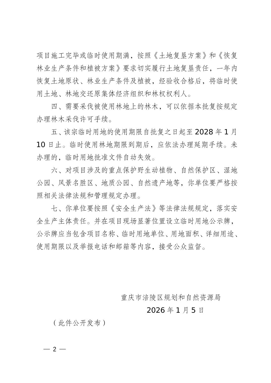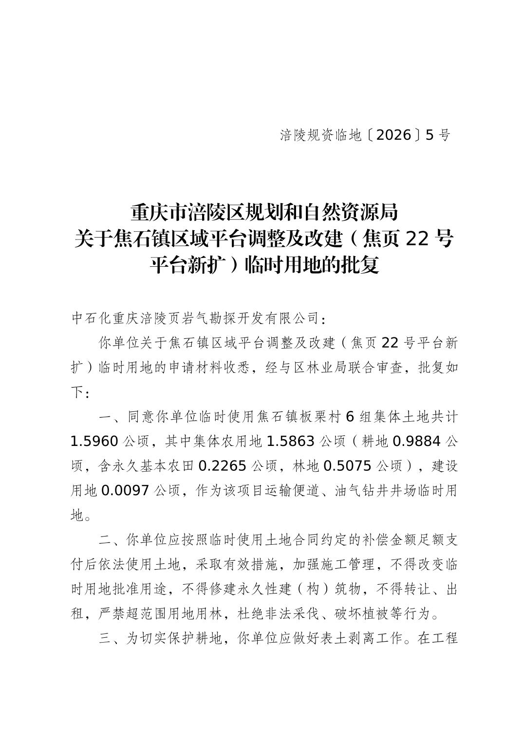 涪陵規資臨地[2026] 5號 關于焦石鎮區域平臺調整及改建(焦頁22號平臺新擴)臨時用地的批復