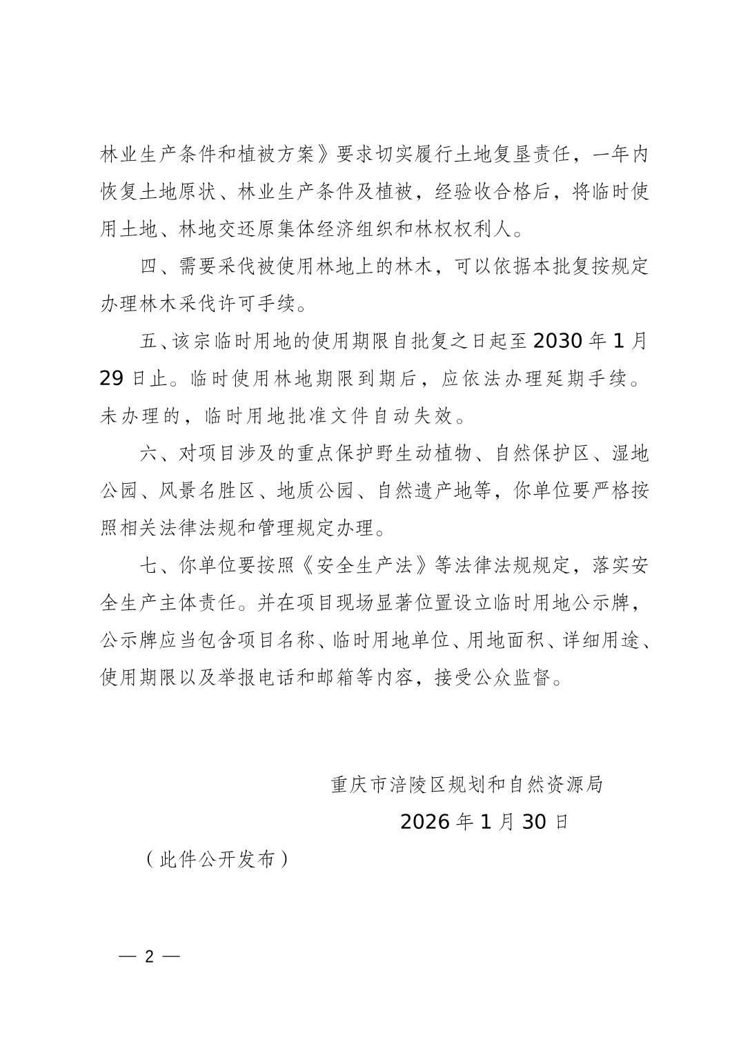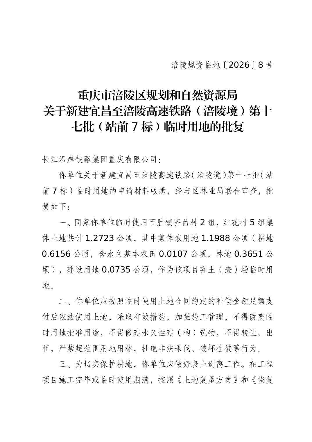 涪陵規資臨地〔2026〕8號重慶市涪陵區規劃和自然資源局關于新建宜昌至涪陵高速鐵路(涪陵境)第十七批(站前7標)臨時用地的批復