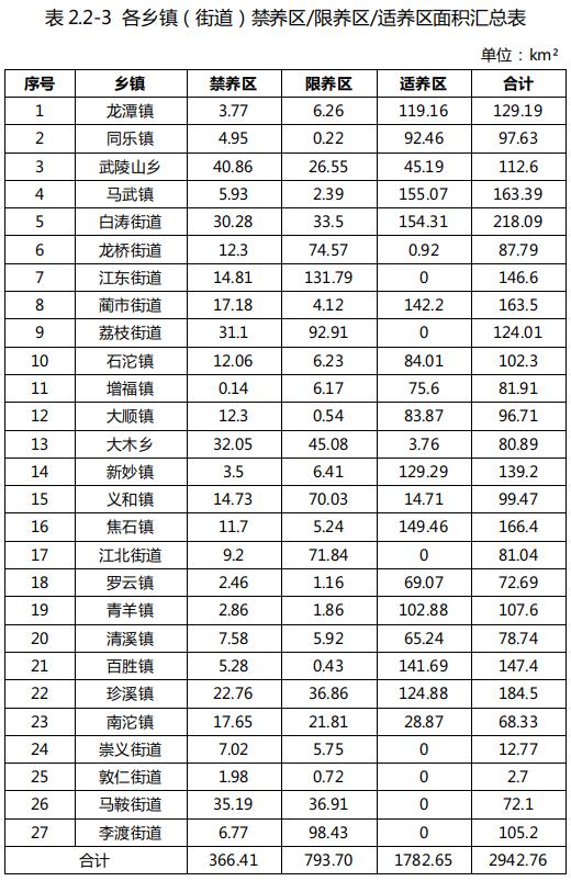 全區禁養區劃定總面積366.41km2,占涪陵區幅員面積12.45%,其中武陵山鄉面積最大,為40.86km2。限養區劃定總面積793.70km2,占涪陵區幅員面積26.97%,其中江東街道面積最大,為131.79km2。適養區劃定總面積為1782.65km2,占涪陵區幅員面積的60.58%,其中馬武鎮面積最大,為155.07km2。