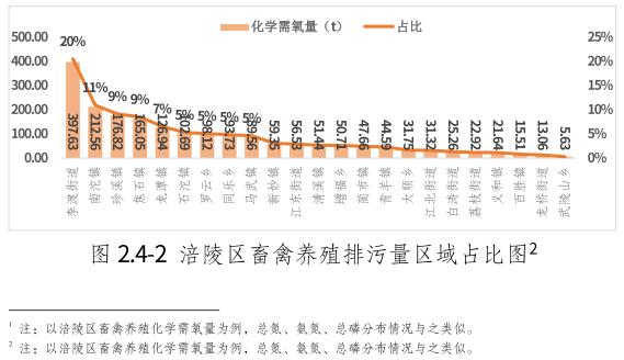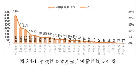 2021年涪陵區畜禽養殖總排污量為化學需氧量1940.47t,總氮量148.38t,氨氮量23.02t,總磷量24.58t。其中規模養殖場的化學需氧量為1154.93t,總氮量80.50t,氨氮量12.89t,總磷量14.21t;養殖專業戶的化學需氧量為785.54t,總氮量67.88t,氨氮量10.13t,總磷量10.37t。主要集中在李渡街道、南沱鎮、珍溪鎮。生豬是排放化學需氧量、總氮量、氨氮量、總磷量的首要貢獻源。以化學需氧量為例,產污區域分布圖見圖2.4-2。