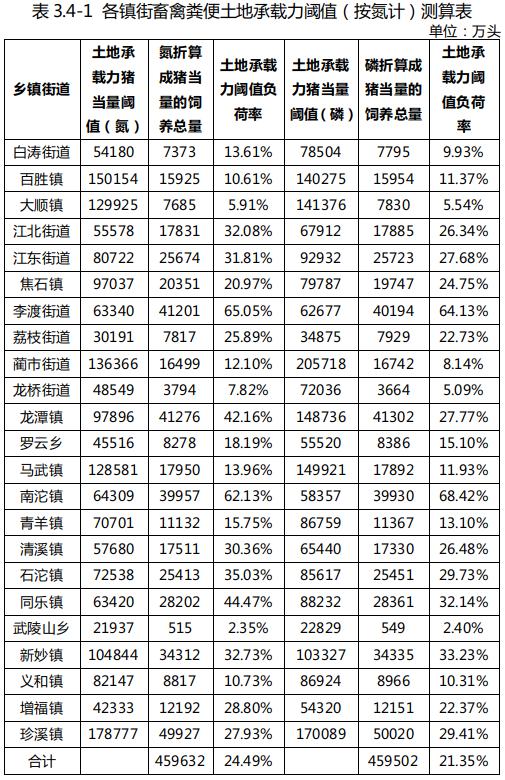 通過計算可知,涪陵區規模養殖場(戶)生豬當量的飼養總量為45.96萬頭(按氮計)和45.95萬頭(按磷計),畜禽糞便土地承載力(按氮計)為234.59萬頭,(按磷計)為269.02萬頭。由此可得,涪陵區畜禽糞便土地承載力負荷率(按氮計)為19.59%,畜禽糞便土地承載力負荷率(按磷計)為17.08%,總體未超出畜禽糞便土地承載力容量。