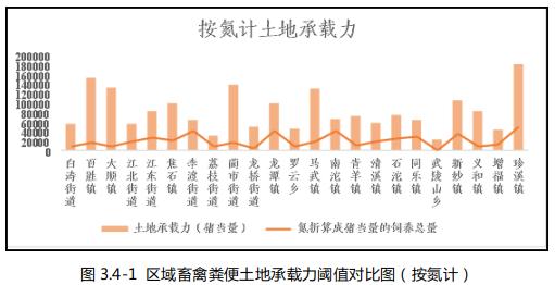 根據分析,涪陵區畜禽糞便土地承載力閾值負荷率(按氮計)為24.49%,畜禽糞便土地承載力閾值負荷率(按磷計)為21.35%,總體未超出畜禽糞便土地承載力閾值容量。其中李渡街道、南沱鎮畜禽糞便土地承載力閾值負荷率超過60%,以上鄉鎮可適當控制養殖規模,如需新建規模養殖場(戶),應保證其畜禽糞污處理設施配套。同時,根據《重慶市涪陵區畜牧業和水產養殖業發展第十四個五年規劃》要求,到2025年,涪陵區各類畜禽養殖年存欄量按氮計生豬當量為59.12萬頭。與涪陵區每年可以承擔234.59萬頭生豬當量(按氮計)相比,到2025年,總體未超出畜禽糞便土地承載力預警值容量。