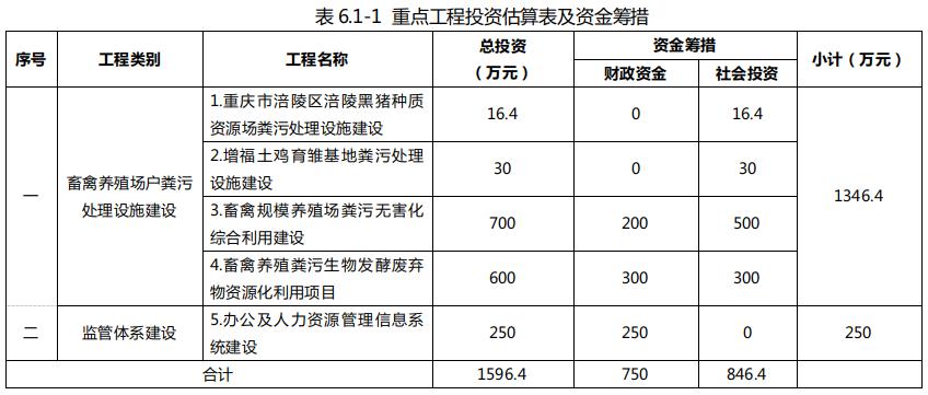 涪陵區畜禽養殖污染防治“十四五”規劃建設項目共5個,其中畜禽養殖場(戶)糞污處理設施建設項目總投資1346.4萬元,監管體系建設項目總投資250萬元,總投資共計1596.4萬元。