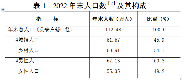 年末全區公安戶籍戶數44.31萬戶,戶籍人口112.48萬人。戶籍人口中,城鎮人口51.57萬人,鄉村人口60.91萬人,戶籍人口城鎮化率45.85%。按性別分布,男性人口57.13萬人,女性人口55.35萬人,人口性別比(以女性為100)為103.2。全年出生人口0.56萬人,死亡人口0.93萬人,人口自然增長率為-3.36‰。