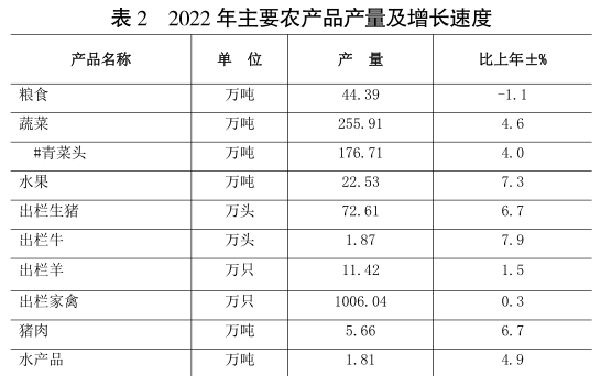 全年糧食總產量44.39萬噸,比上年減少1.1%。蔬菜產量255.91萬噸,增長4.6%,其中青菜產量176.71萬噸,增長4.0%。水果產量22.53萬噸(含西瓜),增長7.3%。中藥材產量3.46萬噸,增長15.1%。