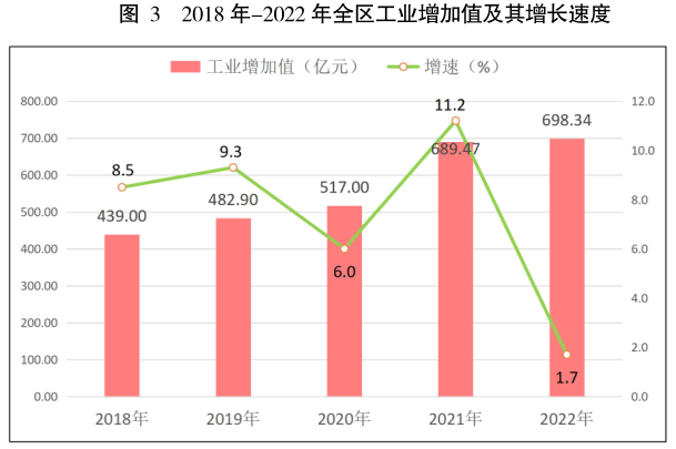 全年實現工業增加值698.34億元,比上年可比增長1.7%,工業增加值占地區生產總值的比重為46.4%。
