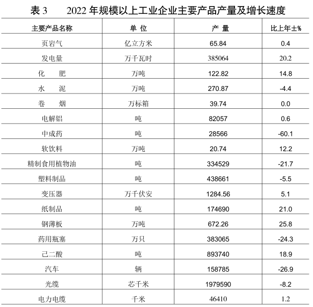 年末規模以上工業企業297戶,其中50億級以上企業10戶,有戰略性新興產業規上企業52戶,14戶企業入選重慶制造業企業100強。2022年規模以上工業企業產值實現2295.31億元【6】,比上年同口徑增長1.1%。