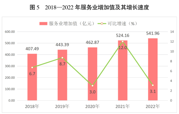 全年服務業實現增加值541.96億元,比上年可比增長3.1%,其中:批發和零售業增加值112.55億元,可比增長0.0%;交通運輸、倉儲和郵政業增加值47.69億元,可比下降1.2%;住宿和餐飲業增加值18.81億元,可比下降1.1%;金融業增加值43.46億元,可比增長5.1%;房地產業增加值68.30億元,可比下降0.8%;其他服務業增加值249.10億元,可比增長6.4%;農林牧漁專業及輔助性活動增加值2.06億元,可比增長6.5%。全年規模以上服務業企業營業收入115.44億元,比上年下降3.6%。