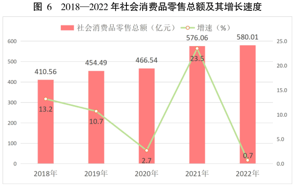 全年社會消費品零售總額【7】580.01億元,比上年同口徑增長0.7%。按經營地統計,城鎮消費品零售額469.59億元,增長0.6%;鄉村消費品零售額110.42億元,增長0.9%。全年批發和零售業商品銷售總額1091.17億元,比上年同口徑增長3.3%;住宿和餐飲業營業額73.72億元,增長0.2%。