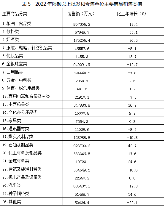 在限額以上單位商品銷售額中,糧油、食品類90.73億元,下降12.4%;飲料類5.79億元,下降33.1%;煙酒類17.52億元,下降20.5%;金銀珠寶類94.03億元,下降12.7%;石油及制品類92.37億元,增長42.7%;汽車類63.54億元,下降12.3%;建筑及裝潢材料類56.45億元,下降16.6%。