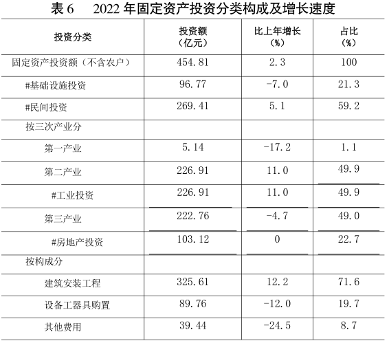 全年固定資產投資額【8】(不含農戶)454.81億元,比上年同口徑增長2.3%,其中基礎設施投資【9】96.77億元,下降7.0%,占投資總額的比重為21.3%;民間固定資產投資【10】269.41億元,增長5.1%,占投資總額的59.2%。