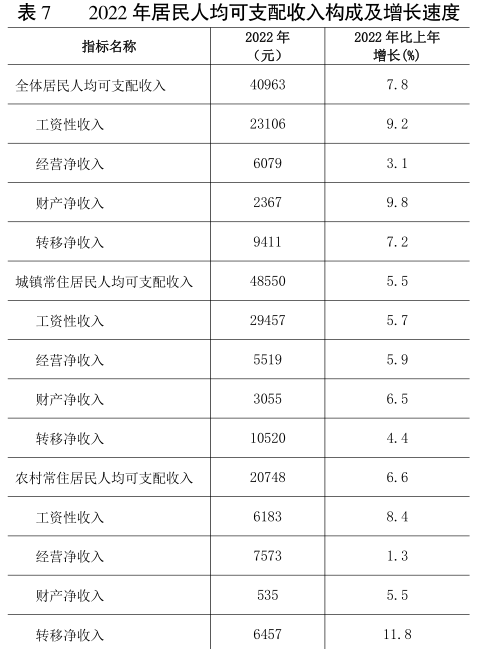 全區全體居民人均可支配收入40963元,比上年增長7.8%【12】。按常住地分,城鎮常住居民人均可支配收入48550元,比上年增長5.5%;農村常住居民人均可支配收入20748元,比上年增長6.6%。
