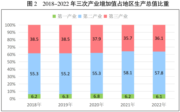 初步核算,2022年全區實現地區生產總值【1】(GDP)1504.37億元,比上年可比增長2.6%。其中,第一產業增加值92.45億元,可比增長3.7%;第二產業增加值869.96億元,可比增長2.2%;第三產業增加值541.96億元,可比增長3.1%。三次產業結構比為6.1:57.8:36.1。全年人均地區生產總值達到13.47萬元,比上年增長2.8%。民營經濟增加值941.30億元,可比增長0.9%,占全區經濟總量的62.6%。