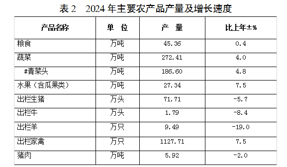 全年糧食播種面積139.47萬畝,較上年增長0.3%。蔬菜播種面積123.07萬畝,增長0.3%,其中青菜頭面積74.03萬畝,增長0.4%。水果種植面積32.79萬畝(含瓜果類),增長1.5%。中藥材種植面積5.14萬畝,增長9.9%。