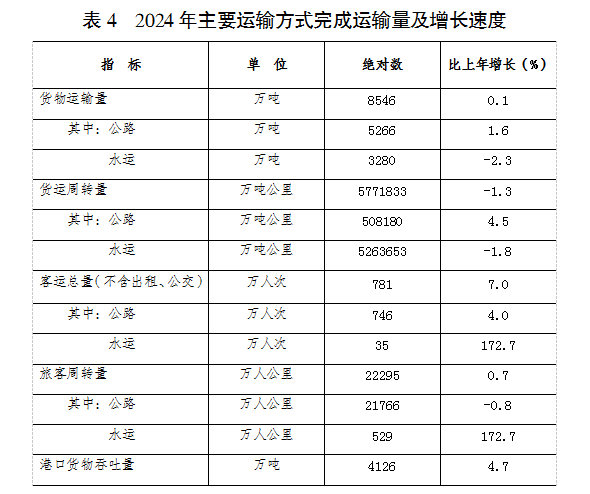 全年公路、水上運(yùn)輸實(shí)現(xiàn)貨運(yùn)量8546萬噸,比去年上升0.1%,實(shí)現(xiàn)貨運(yùn)周轉(zhuǎn)量577億噸公里,下降1.3%;完成客運(yùn)總量781萬人次,增長7.0%,旅客周轉(zhuǎn)量22295萬人公里,增長0.7%。全年港口貨物吞吐量4126萬噸,比上年增長4.7%。