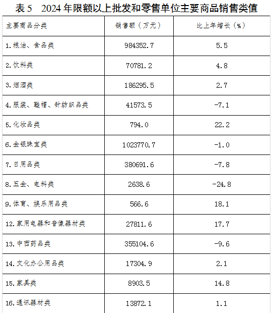 在限額以上單位商品銷售額中,糧油、食品類98.44億元,增長5.5%;飲料類7.08億元,增長4.8%;煙酒類18.63億元,增長2.7%;金銀珠寶類102.38億元,下降1.0%;石油及制品類99.76億元,增長7.3%;汽車類68.07億元,下降0.4%;建筑及裝潢材料類26.54億元,下降13.2%。