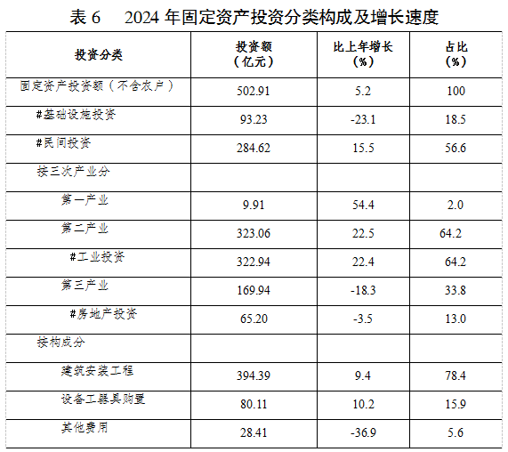 全年固定資產(chǎn)投資額【8】(不含農(nóng)戶)502.91億元,比上年同口徑增長5.2%,其中基礎(chǔ)設(shè)施投資【9】93.23億元,下降23.1%,占投資總額的比重為18.5%;民間固定資產(chǎn)投資【10】284.62億元,增長15.5%,占投資總額的56.6%。
