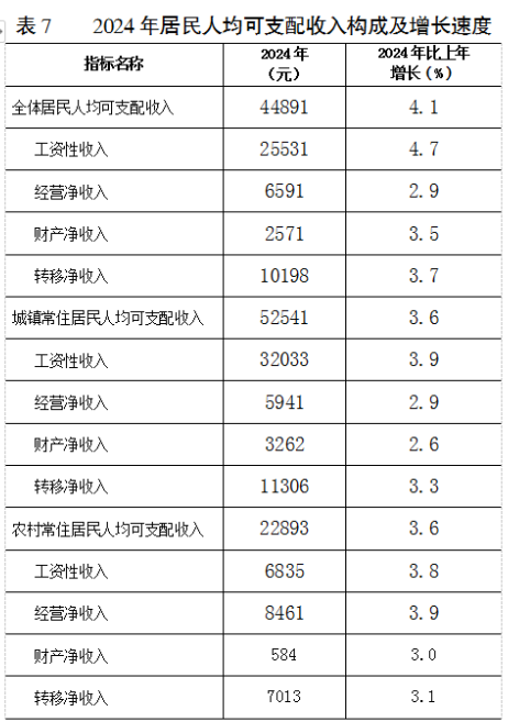 在城鎮(zhèn)常住居民人均可支配收入中,人均工資性收入32033元,增長3.9%;人均經(jīng)營凈收入5941元,增長2.9%;人均財(cái)產(chǎn)凈收入3262元,增長2.6%;人均轉(zhuǎn)移凈收入11306元,增長3.3%。