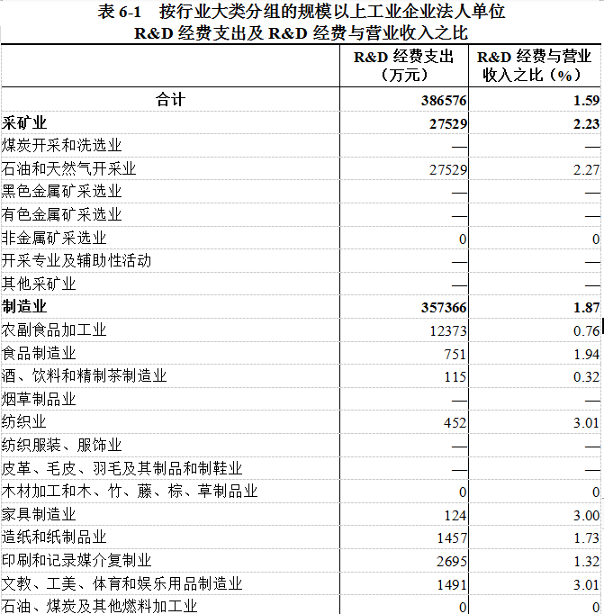 2023年,規(guī)模以上工業(yè)企業(yè)法人單位R&D經(jīng)費(fèi)支出38.66億元,比2018年增長(zhǎng)1.08倍;R&D經(jīng)費(fèi)與營(yíng)業(yè)收入之比為1.6%。規(guī)模以上工業(yè)企業(yè)法人單位分行業(yè)R&D經(jīng)費(fèi)支出及R&D經(jīng)費(fèi)與營(yíng)業(yè)收入之比詳見表6-1。