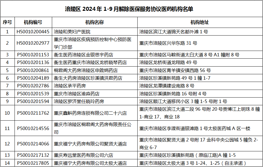 為落實(shí)定點(diǎn)醫(yī)藥機(jī)構(gòu)協(xié)議動(dòng)態(tài)管理要求,根據(jù)國家醫(yī)療保障局《醫(yī)療機(jī)構(gòu)醫(yī)療保障定點(diǎn)管理暫行辦法》《零售藥店醫(yī)療保障定點(diǎn)管理暫行辦法》及《重慶市醫(yī)療保險(xiǎn)協(xié)議醫(yī)療機(jī)構(gòu)服務(wù)協(xié)議》《重慶市醫(yī)療保險(xiǎn)協(xié)議零售藥店服務(wù)協(xié)議》等文件規(guī)定,解除以下定點(diǎn)醫(yī)藥機(jī)構(gòu)醫(yī)保服務(wù)協(xié)議。