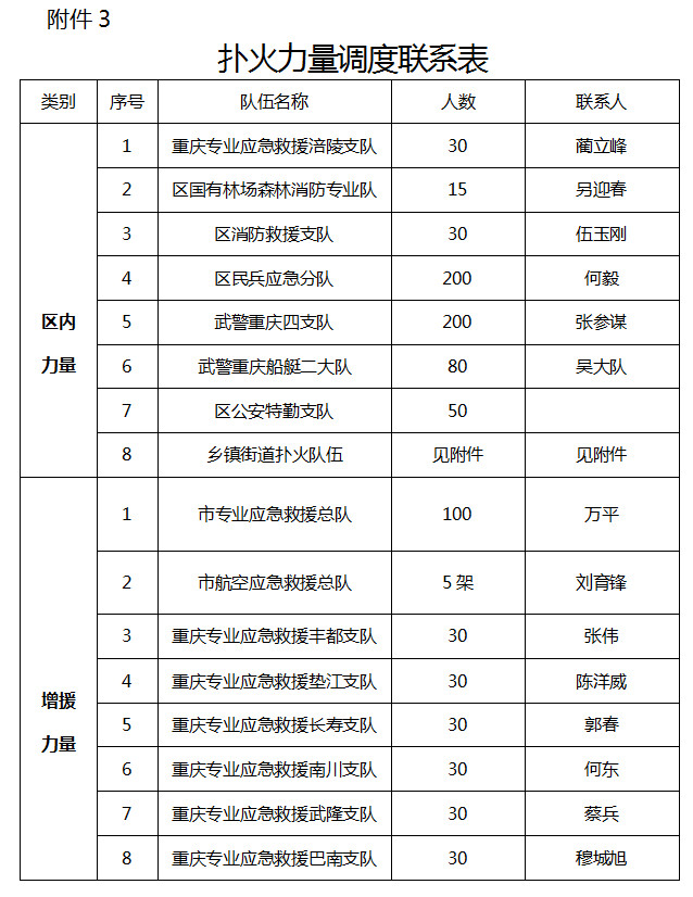 2.?相鄰區(qū)縣撲火隊(duì)伍(180人)。重慶專業(yè)應(yīng)急救援豐都支隊(duì)30人,重慶專業(yè)應(yīng)急救援武隆支隊(duì)30人,重慶專業(yè)應(yīng)急救援南川支隊(duì)30人,重慶專業(yè)應(yīng)急救援墊江支隊(duì)30人,重慶專業(yè)應(yīng)急救援長壽支隊(duì)30人,重慶專業(yè)應(yīng)急救援巴南支隊(duì)30人。