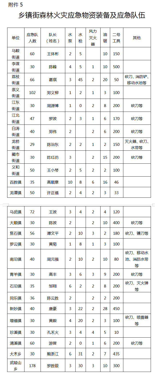 1.?區(qū)級(jí)撲火隊(duì)伍(605人)。區(qū)消防救援支隊(duì)30人、重慶專業(yè)應(yīng)急救援涪陵支隊(duì)30人、區(qū)國有林場森林消防專業(yè)隊(duì)15人、區(qū)民兵預(yù)備役應(yīng)急分隊(duì)200人、武警重慶總隊(duì)執(zhí)勤四支隊(duì)200人、武警重慶總隊(duì)船艇二大隊(duì)80人、區(qū)公安特勤支隊(duì)50人。