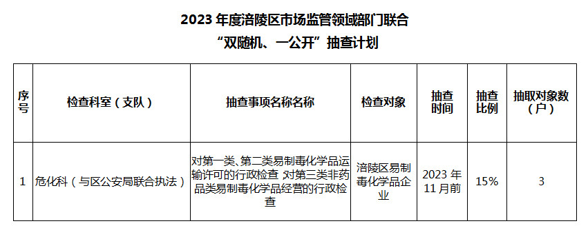 2023年度涪陵區市場監管領域部門聯合“雙隨機、一公開”抽查計劃