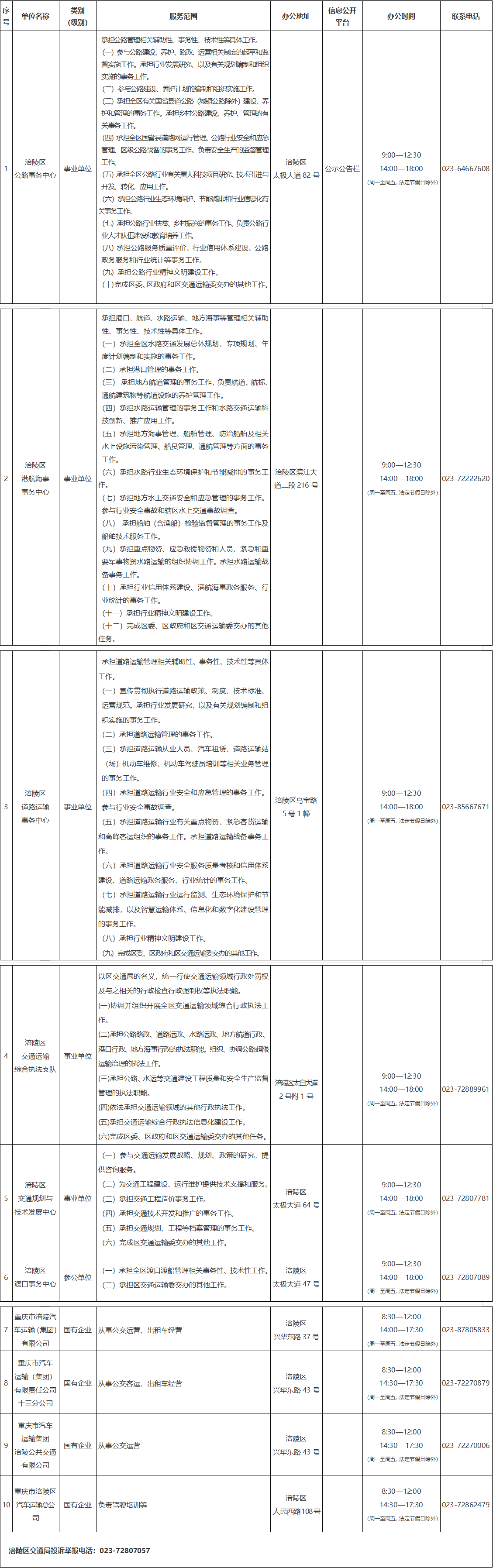 涪陵區(qū)公共交通領(lǐng)域公共企事業(yè)單位信息表