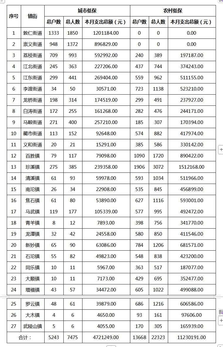 2025年9月涪陵區城鄉居民最低生活保障金發放匯總表