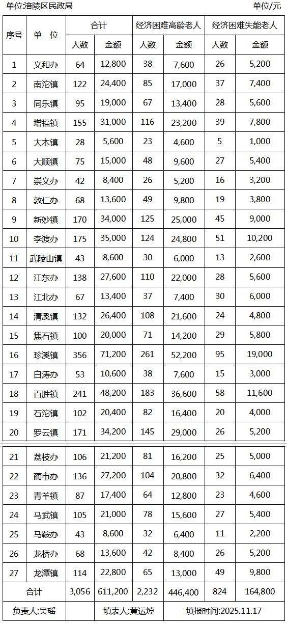 2025年11月涪陵區(qū)經(jīng)濟(jì)困難高齡失能老人養(yǎng)老服務(wù)補(bǔ)貼發(fā)放匯總表