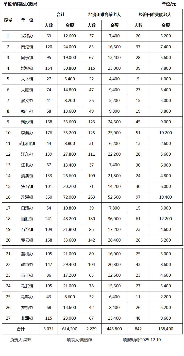 2025年12月涪陵區經濟困難高齡失能老人養老服務補貼發放匯總表