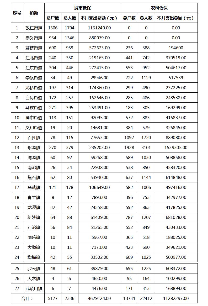 2025年12月涪陵區城鄉居民最低生活保障金發放匯總表