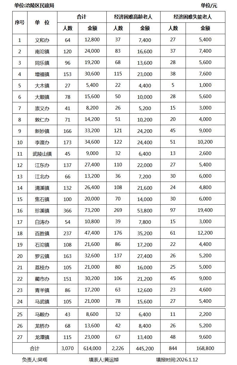 2026年1月涪陵區經濟困難高齡失能老人養老服務補貼發放匯總表