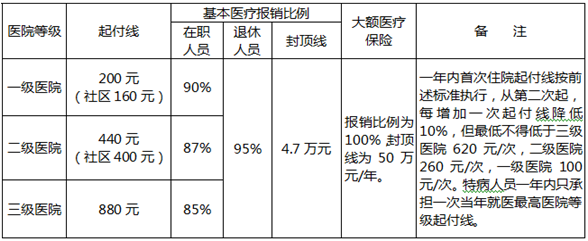 城鎮職工基本醫療保險住院待遇有基本醫療待遇和大額保險待遇。具體待遇如下表: