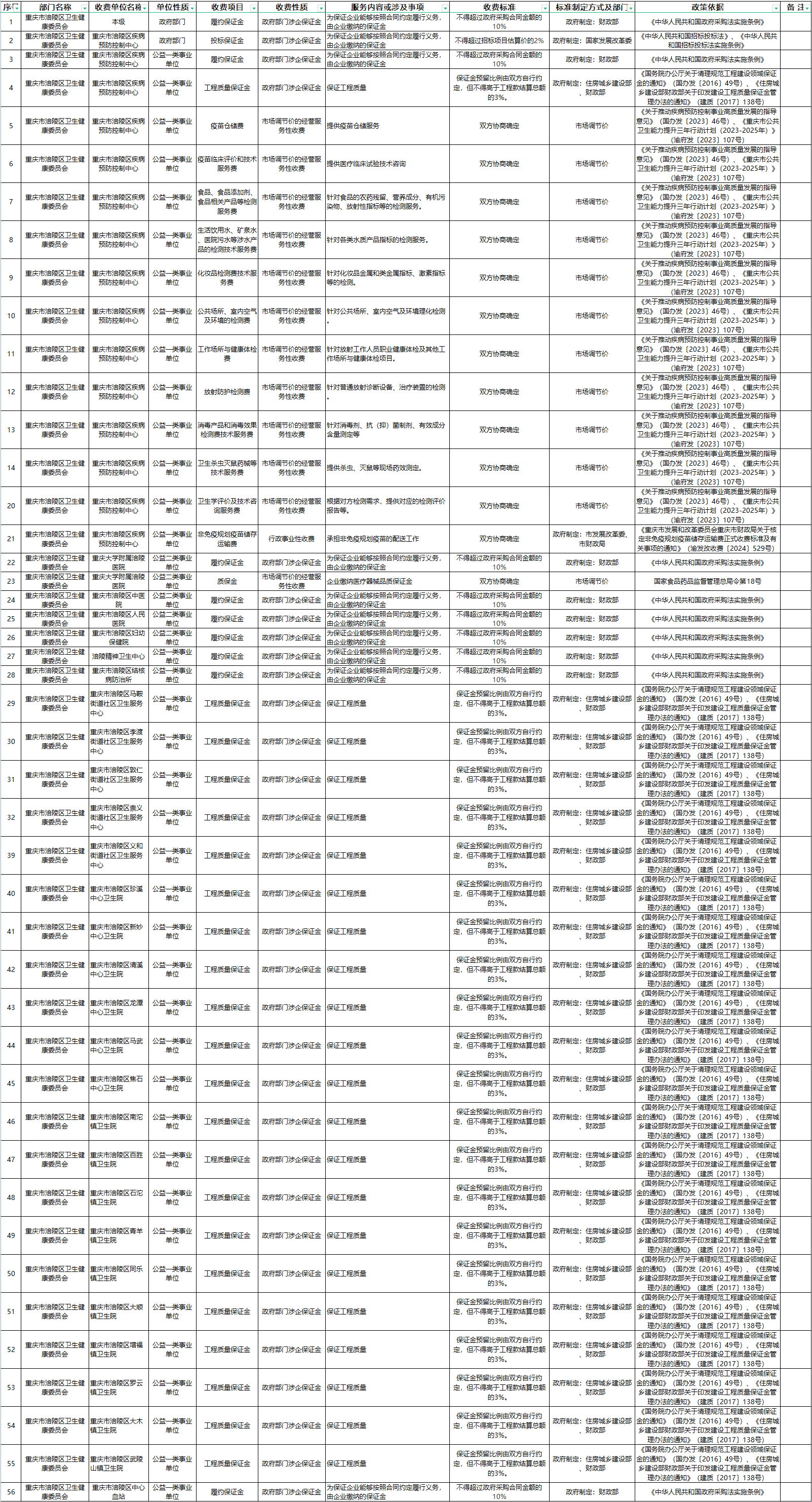 重慶市涪陵區衛生健康委員會及下屬單位綜合性涉企收費目錄清單