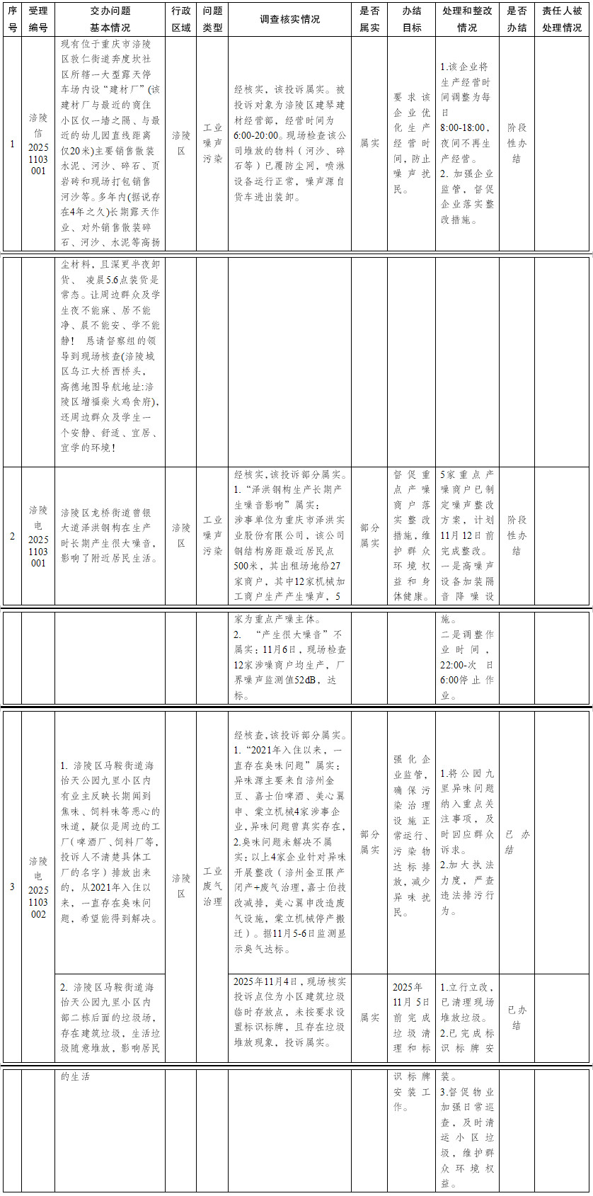 重慶市第二輪第三批第四生態(tài)環(huán)境保護(hù)督察組群眾信訪舉報(bào)轉(zhuǎn)辦和邊督邊改公開(kāi)情況一覽表 (第7批 2025年11月3日)