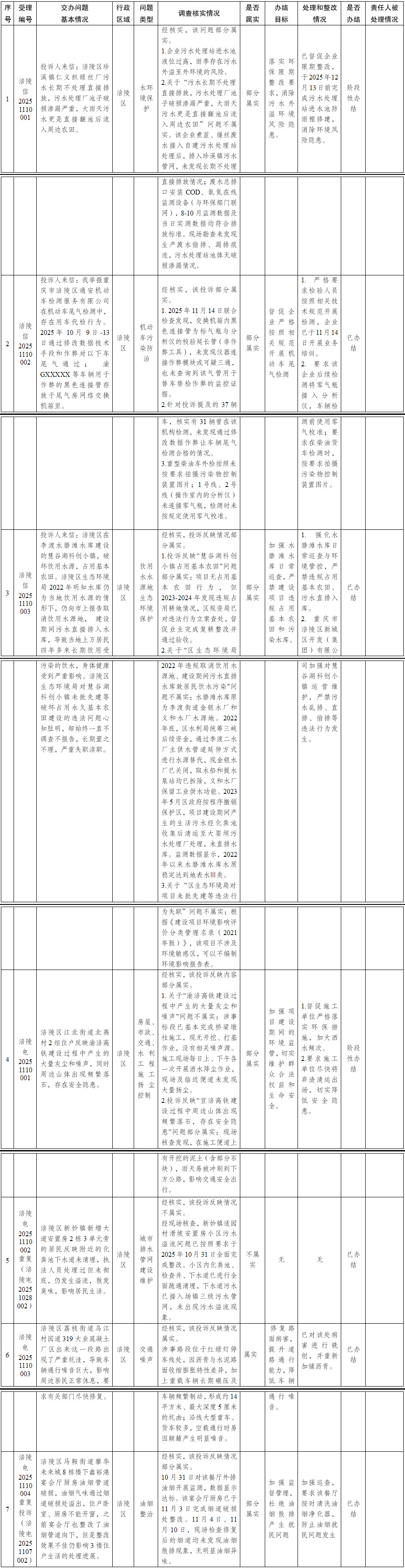 重慶市第二輪第三批第四生態環境保護督察組群眾信訪舉報轉辦和邊督邊改公開情況一覽表 (第12批2025年11月10日)